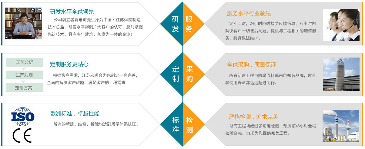 宏順建設工程有限公司是國家批準成立的專業高空作業企業:承攬過(國內.國外)煙囪新建、煙囪防腐、煙囪拆除、煙囪維修、煙囪美化、煙囪脫硫、煙囪滑模、煙囪刷航標等高空作業工程。具有“不搭腳手架 、 不需要停產”施工特點,外出施工人員都經過江蘇省勞動部門的嚴格培訓,考核通過頒發《中華人民共和國特種作業操作證》上崗,施工人員全部在“中國平安保險公司”投入常年人身安全保險。多年來始終本著“安全第一、質量至上 、各類工程、跟蹤服務、講究信譽、確保安全、定期回訪。"